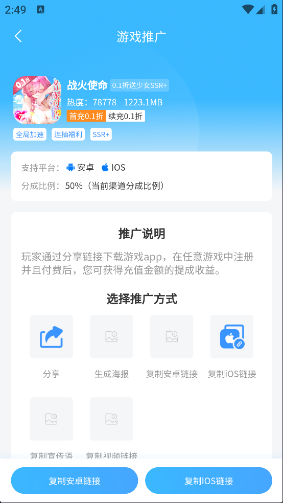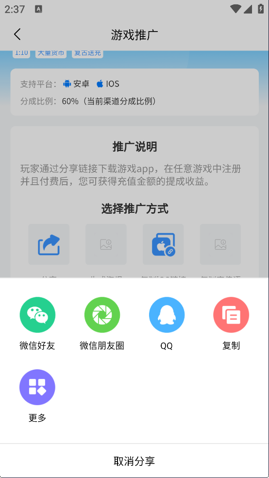 玩家通过分享链接下载游戏app,在任意游戏中注册并且付费后,您可获得充值金额的提成收益。