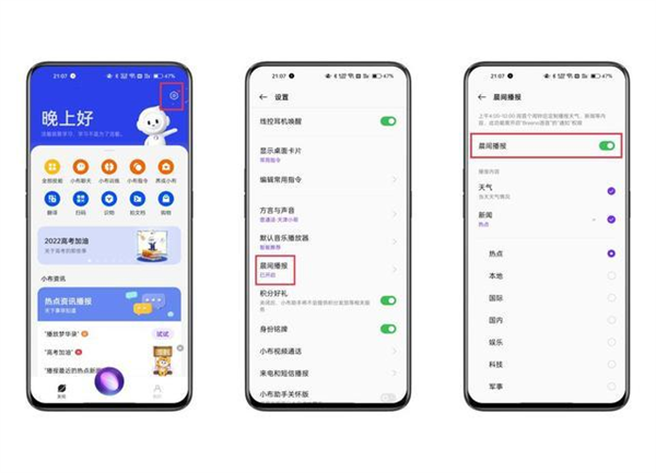 晨间播报(小布助手)开启/设置路径:打开小布助手—右上角设置—晨间播报(开启)—设置播报内容(新闻可定制内容)