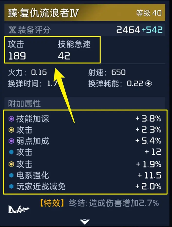 装备词条不仅直接提供属性加成,还会根据属性数量及品质影响装备的基础属性,例如下图,同样是至臻品质的40级复仇流浪者,不同改装词条对应的装备基础属性也有不同。