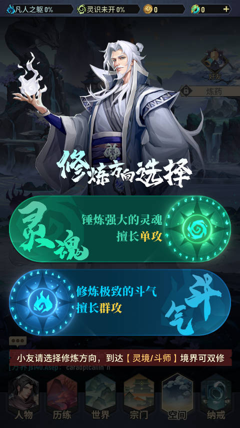 首先,成功登入后会进到主页面,可以选择要修炼斗气或魂力(境界突破到灵境或斗师后可以选择斗气魂力双修)