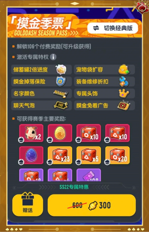 购买经典季票可获得储蓄罐2倍进度专属头饰、名字颜色聊天气泡、经典免看广告等特权。