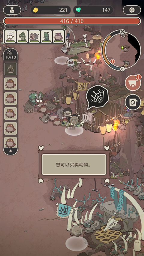 根据攻略指南,红圈部分是背包,可以存放大量物品;黑圈是设置背景音和效果音的地方;黄圈则是购买遗物宝箱的商店。此外,普通动物商店可以让玩家购买已解锁的动物并查看它们的能力,管理英雄动物和装备的部分也很实用。游戏特色包括驯服各种动物、收集特殊装备、解决特殊事件等。