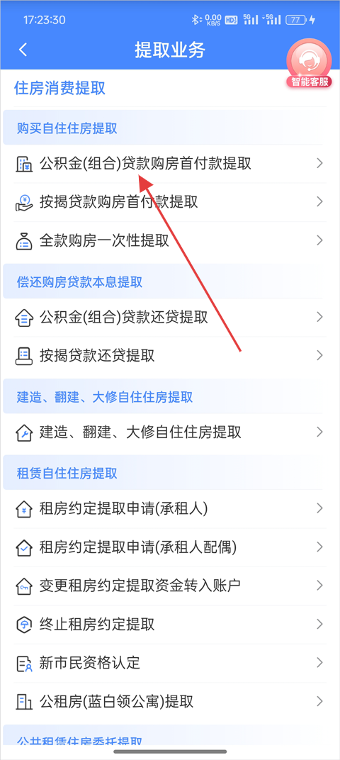 2、这里提供了非常多的提取方式大家根据自己需求选择,这里以【公积金(组合)贷款购房首付款提取】为例子