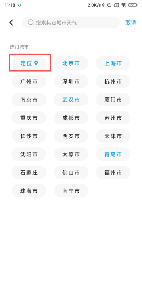 3、在搜索栏搜索你所在的城市或点击【定位】进行定位;