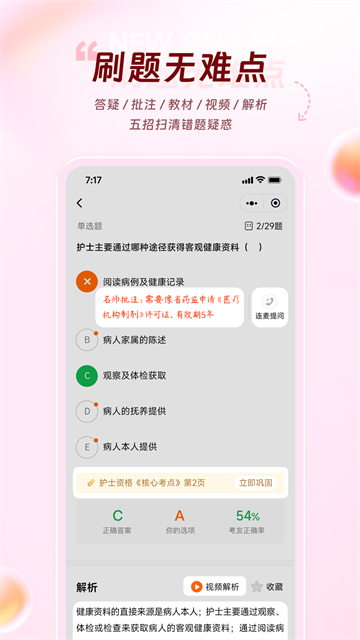 app还有不少特色功能,比如护理社区可以交流心得,视频讲解每道题,还有一对一助教服务。海量题库支持多平台使用,人机对话模拟真实考试,帮助你提前进入备考状态。