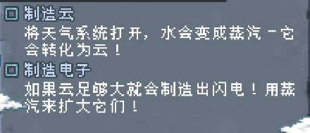 玩家在刚进入游戏的时候是需要根据任务提示去完成一系列的关卡任务,在游戏刚开始的时候,是一些引导关卡,帮助玩家了解这款游戏的相关操作,如玩家将soil和stone放入水中,soil就会变成mud,stone则会变成sand,这样就可以轻松完成关卡的条件了,而且游戏中的天气、温度也是可以进行调节的,如点击天气按钮就可以在里面选择sun、werther等天气选项,在不同的关卡所需的天气条件也是不一样的。