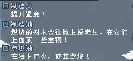 先点击五号按钮,将温度调成hot,完成一项任务。树烧尽后形成火堆,在火堆旁边放一点石头,等一段时间后生成油。在第一个按键中购买火,将油点燃,本关完成。