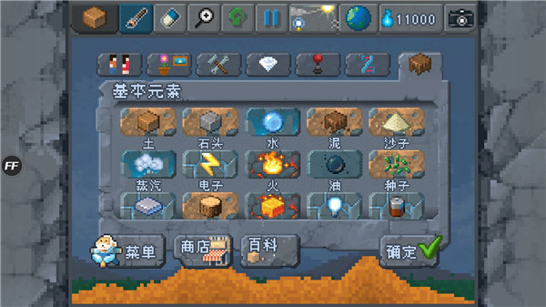 进入游戏是一片水,点击左上角第一个按钮,选择土和石头放入水中,一段时间后会得到泥和沙子,本关完成。