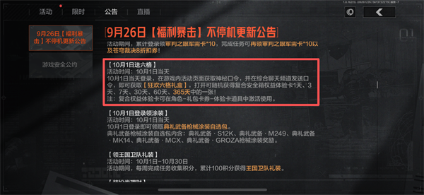 最近官方推出了新活动,10月1日登录游戏可免费领取六格体验卡,最长可持续一年。同时,大赢家物资赛也正在火热进行中,初赛阶段推荐选择适合当前节奏的装备和战术,如远程压制套装和激进点位架点击杀收益高的策略。