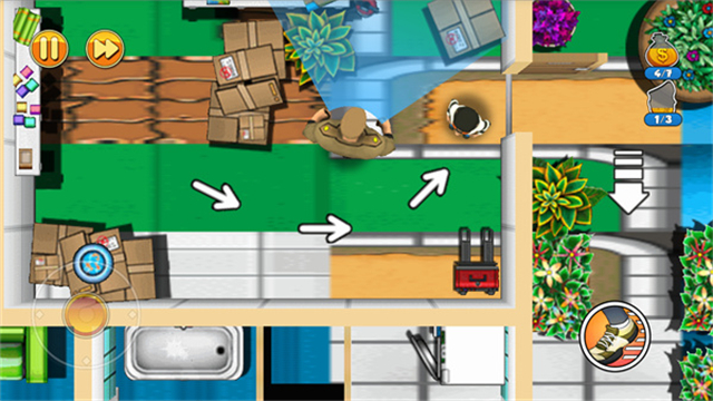 游戏里还有不少小细节,比如快跑虽然能节省时间,但也会引来更多注意,所以得谨慎使用。另外,除了宝箱里的钱,一些闪着光的地方也能拿到零散的钱财,这些都得记得收集才能满足三星通关的要求。