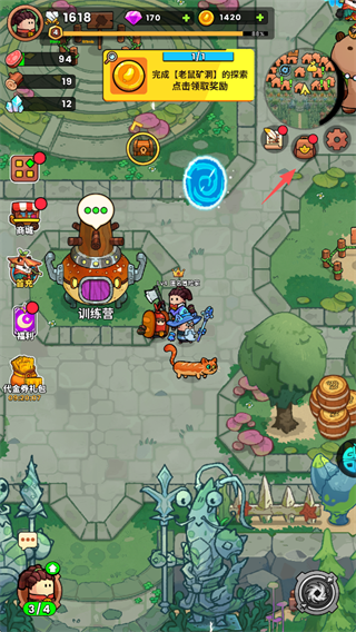 2、按照指引前往指定区域解救英雄,解锁新的区域后可以通过收集木头来建造训练营,前往训练营可以解锁新的技能,技能达到指定等级后可以激活新的英雄阵位