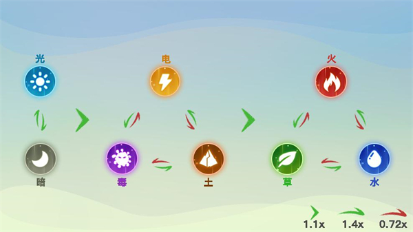 光、草、水之间的克制伤害与电、毒、土的克制伤害同理