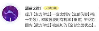 提升【友方单位】一定比例的【全部伤害】(唯一生效)。释放技能时有机率【重置】半径范围内【敌方单位】被施加的【全部负面状态】