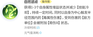 获得1~3个自身属性增益状态并减少【技能冷却】,持续一定时间,同时以自身为中心触发半径范围内的【毒属性伤害】,受到伤害的【敌方单位】会被附加【易伤I】状态。