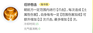 朝前方一定范围内进行【爪击】,每次造成【士属性伤害】,自身每有一定【范围伤害加成】可额外增加【1】次爪击,最多增加【3】次。