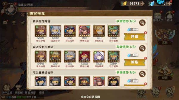 每个队伍的风格根据自己所拥有的的角色搭配。如果萌新角色不充足建议优先选择高续航生存队,可以牺牲部分伤害更换盾辅在c位,第二排选择单体高爆伤和群伤作为输出,后排就可以选择治疗辅助或者叠加负面buff类的角色。