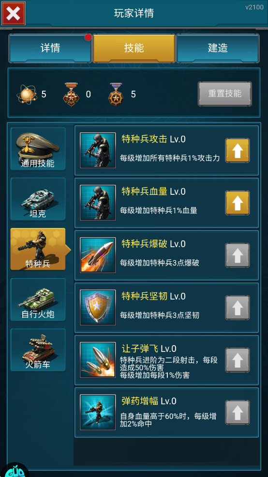 指挥官也可以通过升级自身技能,来提升战力。提升技能需要消耗技能勋章,技能勋章可通过战役胜利、战役箱子、军团捐献、军团副本等来获得,另外最直接的方式也就是在商城进行购买,总而言之,指挥官除了要多多升级坦克之外,别忘了自我提升哦。指挥官技能根据自己的部队情况选择升级哦。
