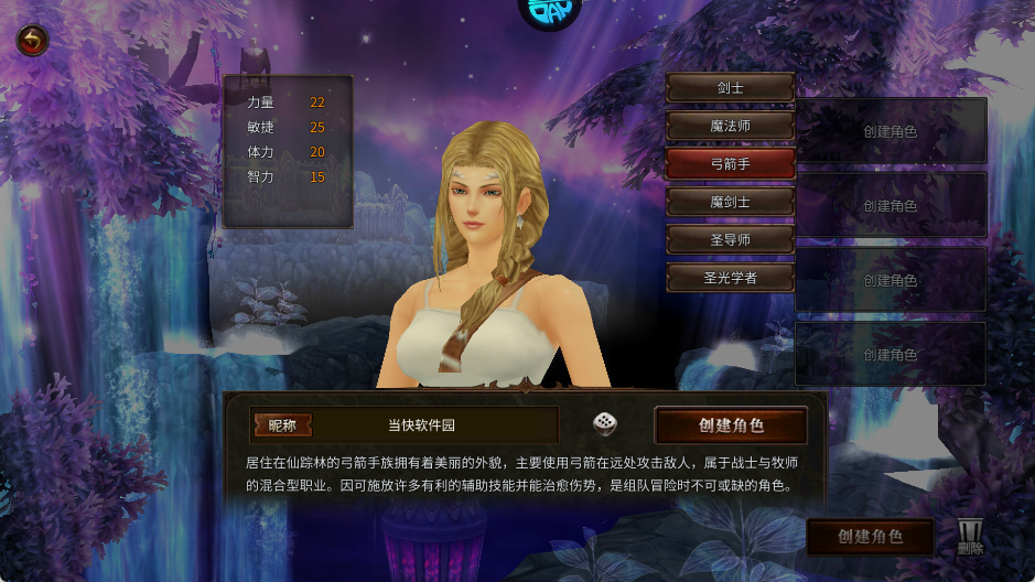 居住在仙踪林的弓箭手族拥有着美丽的外貌,主要使用弓箭在远处攻击敌人,属于战士与牧师的混合型职业。因可施放许多有利的辅助技能并能治愈伤势,是组队险时不可或缺的角色。