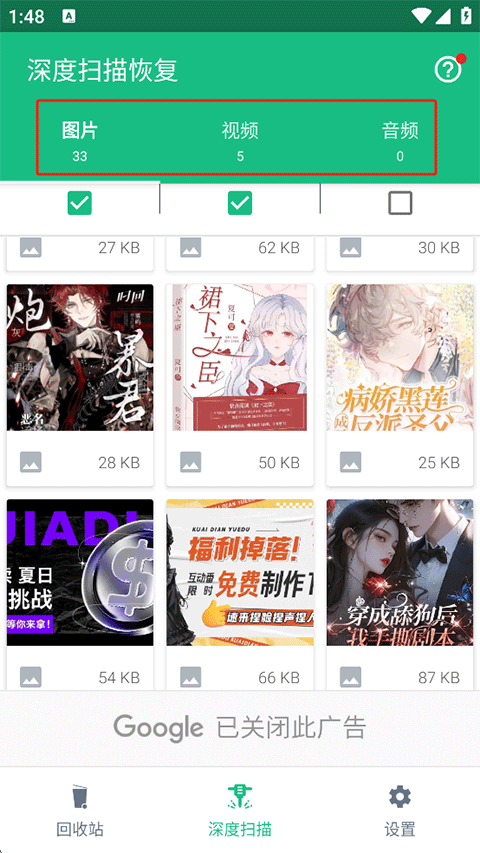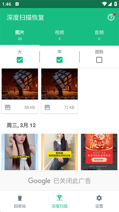 3、除了可以恢复手动删除的文件外,一些被系统删除掉的缓存图片、音频及视频也能被扫描出来。