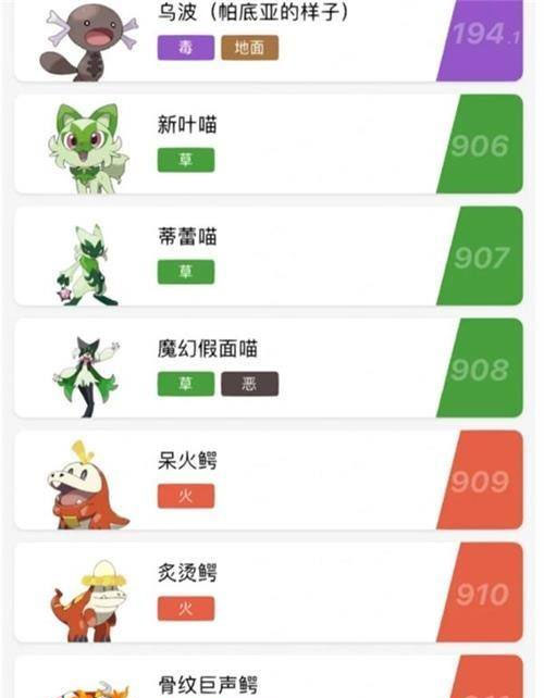 新叶喵、蒂蕾喵、魔幻假面喵、呆火鳄、炙烫鳄、骨纹巨声鳄、润水鸭、涌跃鸭、狂欢浪舞鸭