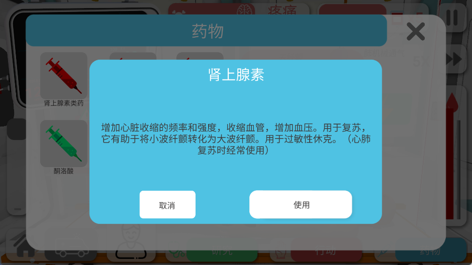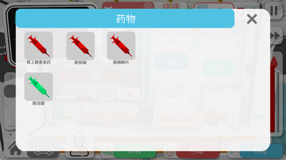 底部:医疗工具栏(药物、仪器、注射器、输液器等)。