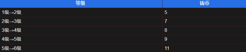 单击鲍勃头像左侧的按钮,可以升级酒馆。酒馆星级越高,刷新后可能出现的随从星级就越高,数目也会变多。升级酒馆需要的铸币数如下表所示,每个回合会减少1点。