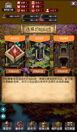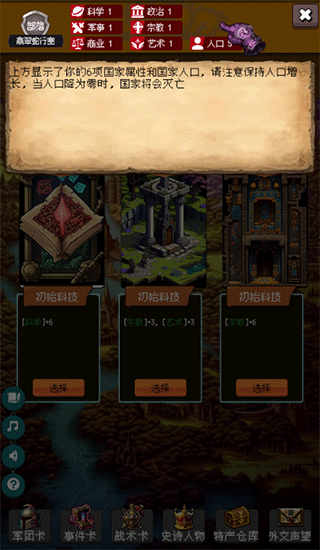 科学、政治、军事、宗教、商业、艺术,这些属性是你的国家综合实力的可视化指数,它们将决定你的国家是继续发展还是陷入停滞——因为后续的大量国家事件都需要以这些属性为前提,提高这六个属性的方法是①发展科技②史诗人物属性加成。