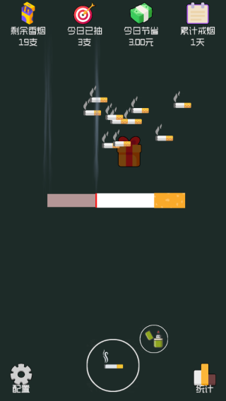 游戏玩法也很简单:点击打火机点火,然后在合适的机会停止抽烟就能获得奖励,一发命中还能额外获得十支香烟。另外,你还可以自定义香烟的价格、焦油量和尼古丁含量,还挺贴心的。每次抽烟或想抽烟的时候都可以来玩一把,记录下自己的进步,分析每日抽烟花费和健康状态,感觉这个游戏不仅好玩,还能帮助你科学戒烟,真的很不错!
