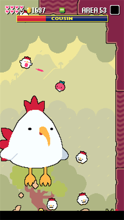 2、通过点击屏幕的左右两侧来操控小鸡猛撞敌人来打败他们,但是也要记得躲避他们尽量不要被射中哦;