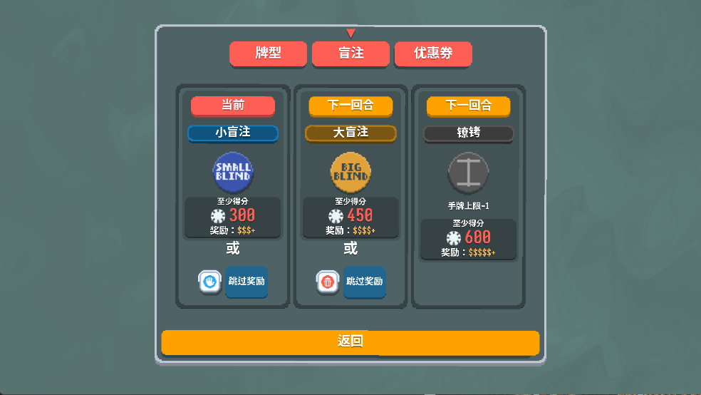 4、模组里新增了10种盲注,但对新手来说风险很大,建议前期尽量选择简单的盲注挑战,等牌组强度起来后再尝试更高难度。