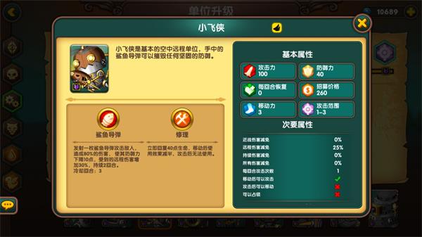 战舰,伤害高,飞行单位,坦度也高,但和坦克一样,不能对空,打兵还是两下一个,不灵活,价格也高,一般用不到。不过技能在打电脑时挺好用(憨憨电脑站着让你随便炸)但也就在特殊地图或者难度高一些的图里用,其他图还是不如飞侠(因为移动后不能攻击,更适合防守,推进还是飞侠香一些)