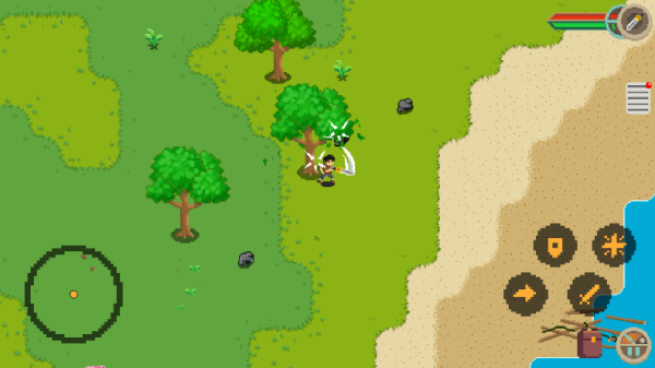 进入游戏后,首先创建存档并输入名字就能开始冒险了。通过右侧的技能键可以控制角色攻击或防御,移动也很方便。砍树、砸石头这些基础动作做完后,还能解锁更多高级功能,比如建造房子或者制作武器。背包里装满各种资源,感觉自己就像一个真正的生存专家。