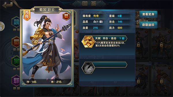 2、大致打法:刘备是联动徐庶上阵成长;马超自我成长;张角其他角色阵亡成长;魏延飞升后回合加攻,总之就是通过二维的不断成长,消耗掉对手的上阵英雄,自身存活,不断打出卡差;