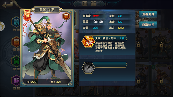 《铜雀三国》是一款以三国时期为背景的策略卡牌手游。玩家化身主公,招募历史名将,通过灵活的流派搭配和策略布局,在战场上实现翻盘。游戏的核心玩法围绕卡牌升级、技能提升以及不同战术选择展开,玩家可以根据自己的喜好选择法伤流、打脸流、成长流等多样化的阵容。