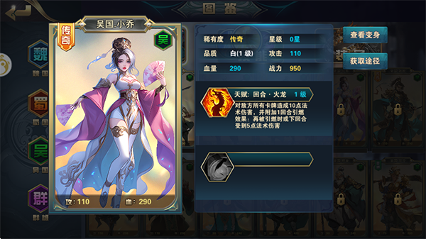 2、大致打法:通过站场,消耗对手卡牌获胜,单一回合爆发极高,完全能团灭对方。首先周瑜必须飞升提供50%加伤的借法技能;孙策由于是绝世卡,技能等级很难升级;回合输出的重任就来到了孙权,小乔这里;