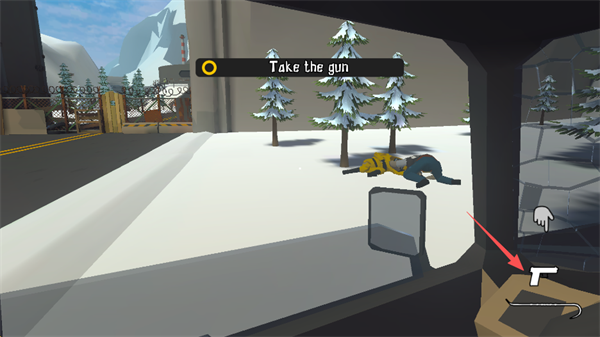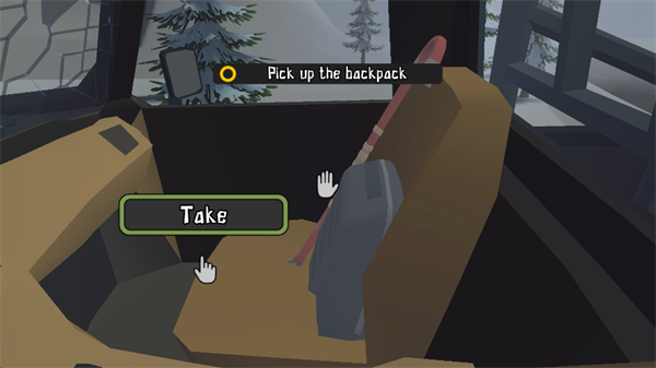 1、进入24号地堡游戏结束剧情,撞车后,视角向右移动,随后点击“Take”,拾取背包和撬棍。