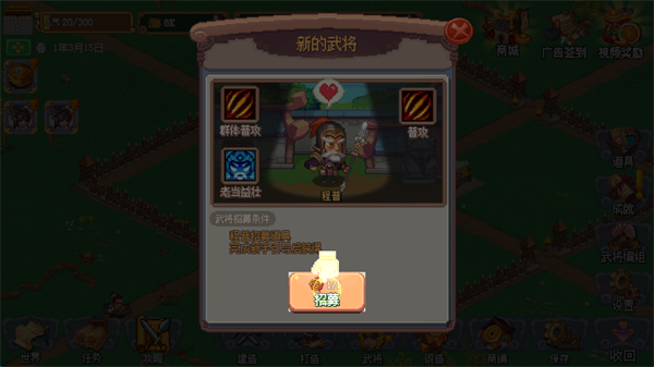 2、打败土匪需要更多的战力,通过“招募”招募新的武将。