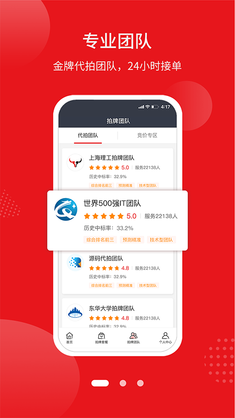 2、严格筛选拍牌团队,采用动态监测和淘汰机制,保证用户中标率的稳定和领先。