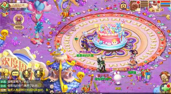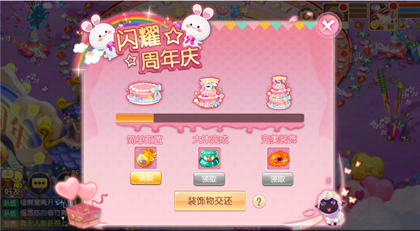 当少侠不断找回,广场的蛋糕装饰物会逐渐完善,完善到对应阶段可以领取阶段奖励哟!奖励包括超级书、龙晶和周年庆法印等好礼!
