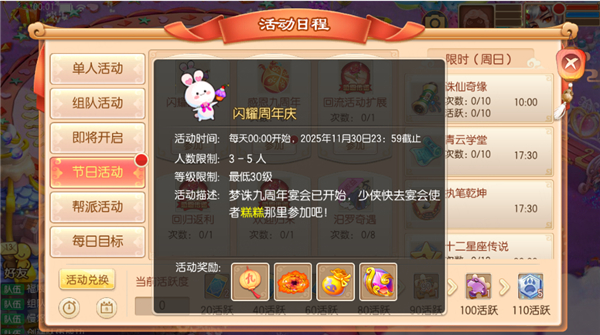 11月1日-11月30日23点59分,等级≥30级的少侠可以3-5人组队参与【闪耀周年庆】活动。快快前往各地收集被偷走的装饰物,狠狠打地鼠,让它们将兑换道具交出来!