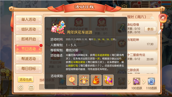 11月1日-11月10日23点59分,等级≥30级的少侠可以参与【花车巡游】活动。点击活动面板参加按钮或频道内链接,可传送至花车附近。