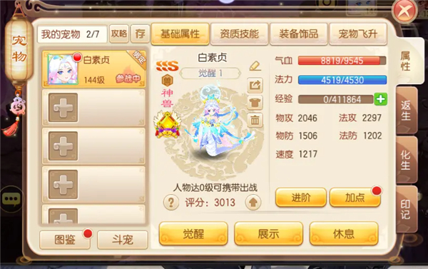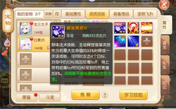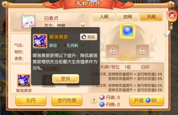 在神兽进阶之后,技能的伤害系数将会得到提升,增伤比例也会提升,技能攻击目标数量还会得到增加。「碧落黄泉」技能奥义:降低碧落黄泉每损失当前最大生命值条件为30%。