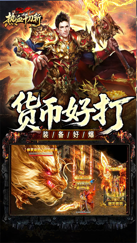 热血千刀斩传奇手游武器、装备、时装全靠打,只要玩家愿意刷图,一身豪华装备不是梦,各种福利活动,挂机达到在线时长,可领取大量元宝、灵符。100%攻速、100爆率让你爱不释手,走到哪砍到哪,一键回收功能,帮助你清理不必要的装备。热血千刀斩官方版还拥有多种活动玩法,如真假鸡王、土城跑酷、猎魔工会、太初迷阵等特色玩法!