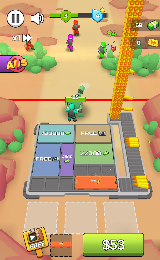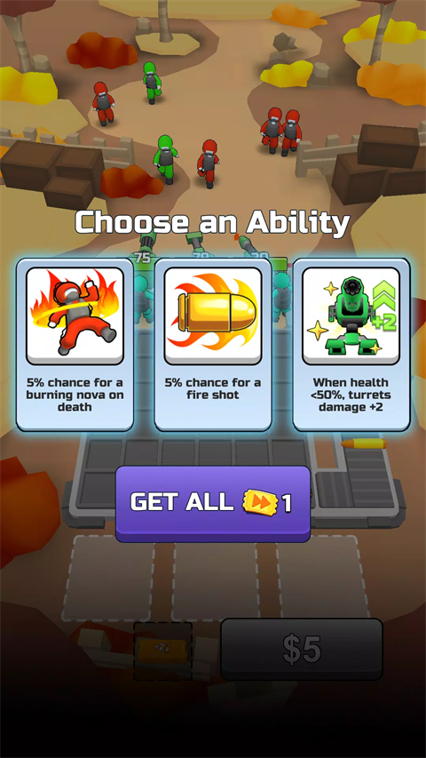 子弹狂热(Bullet Fever)是一款具有塔防元素的休闲射击游戏,玩家将操控手持加特林的士兵抵御不断涌来的丧尸潮,并通过消灭丧尸获取金币,以提升子弹补给速度保证火力持续输出。随着战斗推进,子弹狂热游戏内玩家还能在每波丧尸潮后从三项随机增益中选择强化效果,例如提升子弹伤害、增加弹道数量,或为子弹附加燃烧、冰冻等特殊属性——火焰可造成持续伤害,冰冻则能有效减缓丧尸移动速度,其丰富的属性组合与武器升级路线,可助你在尸潮围攻中坚守更久!