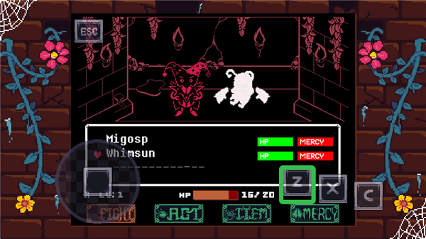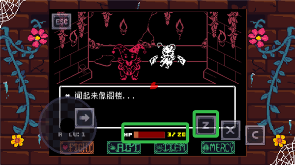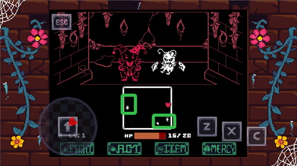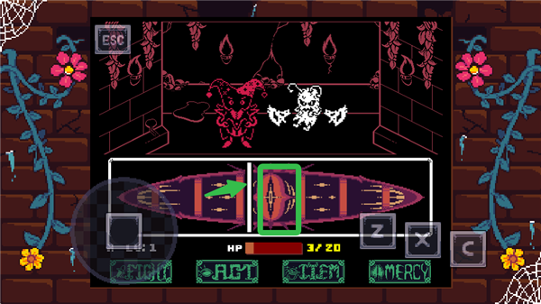 战斗系统有点挑战性,需要精准操作Z键攻击怪物,还要灵活躲避白色攻击。看着红心来回移动,得把握好时机才能打中,如果没打死还得继续来一轮,挺考验手速和反应力的。游戏的画面用了高对比度像素风格,看起来还挺有特点的。
