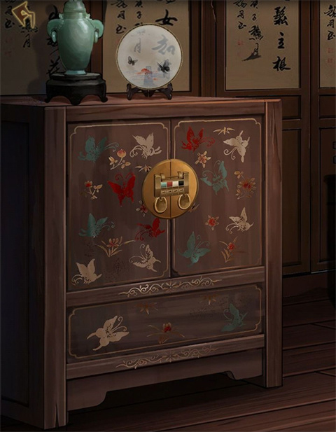 柜子及扇面上分别有青、红、白、黑蝴蝶五、三、六、二只