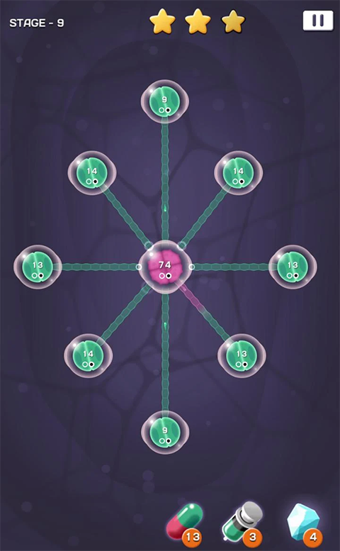 一部分关卡需要你主动放弃母细胞,利用②强行夺取一些子细胞作为“新阵地”,“卧薪尝胆”,最后成长起来了再攻回去。