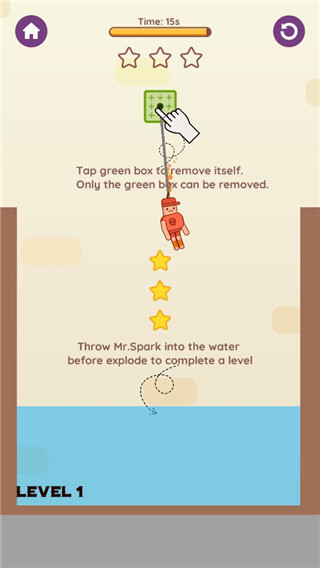 4、倒计时时间:点击蓝色的盒子,使星火先生落入水中的时间用完之前。