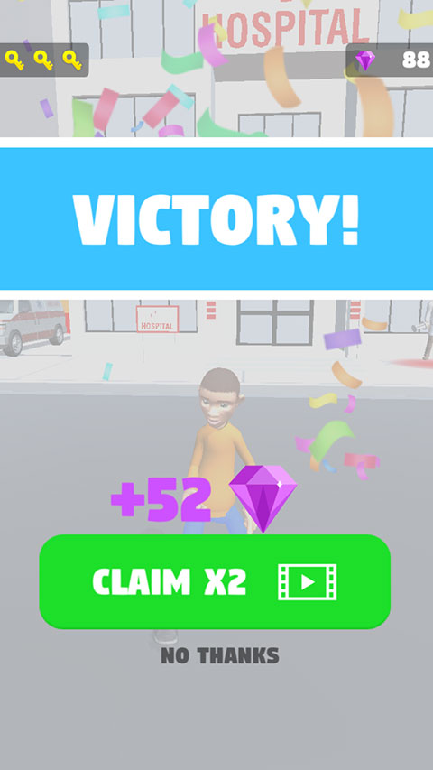 当你在倒计时结束后,能够顺利从医生手中逃出,就可以获得本关的胜利。不过随着医院逃生者游戏进度的提升,难度也会有着明显的上升,其中最突出的当属医生数量的增多了。这时你将会体验到更加惊险刺激的追逐战斗,不同的医生将会提着巨型针筒从四面八方赶来围剿你,这种压迫感可不是一般人能承受的。不过好在医院逃生者最新版中还提供了属性升级功能,玩家只需要消耗对局中获得的宝石即可强化角色的移动、跳跃等属性。从而能更加轻松地应对医生的追捕。游戏目前非常热门,想体验的小伙伴赶紧来下载试试吧!