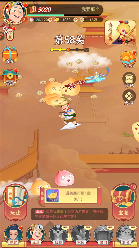 闹闹嘻游游戏中玩家还可以激活天命、提升法宝,以增强实力,当达到足够战斗力后可前往西行之路、长安轶闻、三界趣事、大闹五庄、限时、斗法、冒险等玩法!
